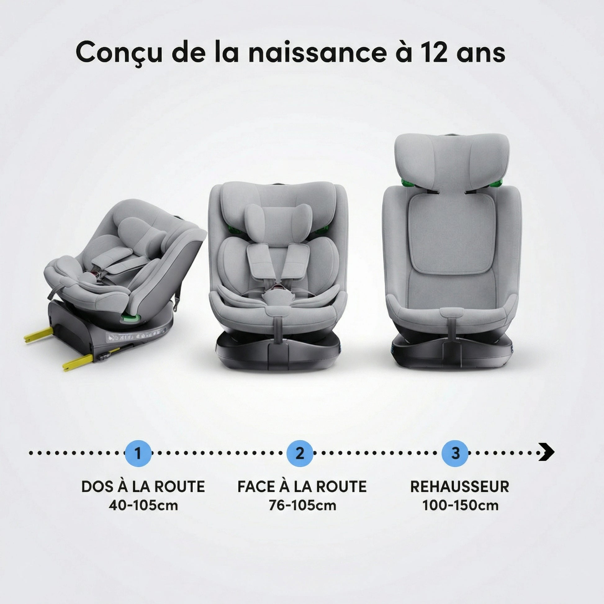 Le siège auto rehausseur avec dossier gris garantit une sérénité totale lors des déplacements grâce à la structure renforcée par des protections latérales avancées. La rotation à 360° permet d'orienter le dispositif face à la portière, simplifiant l'installation de l'enfant avant de le placer en position dos ou face à la route. Au sein de la collection siège auto rehausseur avec dossier, le modèle se distingue par sa polyvalence extrême, couvrant les besoins dès la naissance jusqu'à 12 ans. Pour les parents privilégiant une esthétique plus sombre, le siège auto rehausseur avec dossier noir offre une fixation ISOFIX et une sécurité rigoureusement identiques.